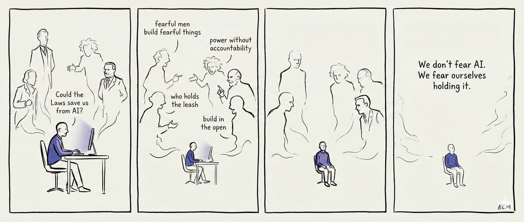 Asimov's Laws failed because they were imposed from above. Arendt said those who fear power loss will never build safely. Jung said fearful men build fearful things. Einstein said build in the open or not at all.